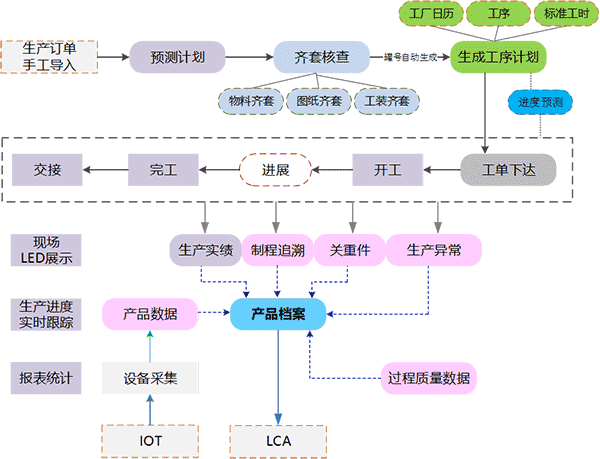 本次绿色智造项目主要实现了生产订单管理、物料及工艺相关的点检、作业计划派工、工序检验、生产异常提报、质量追溯辅助现场生产。